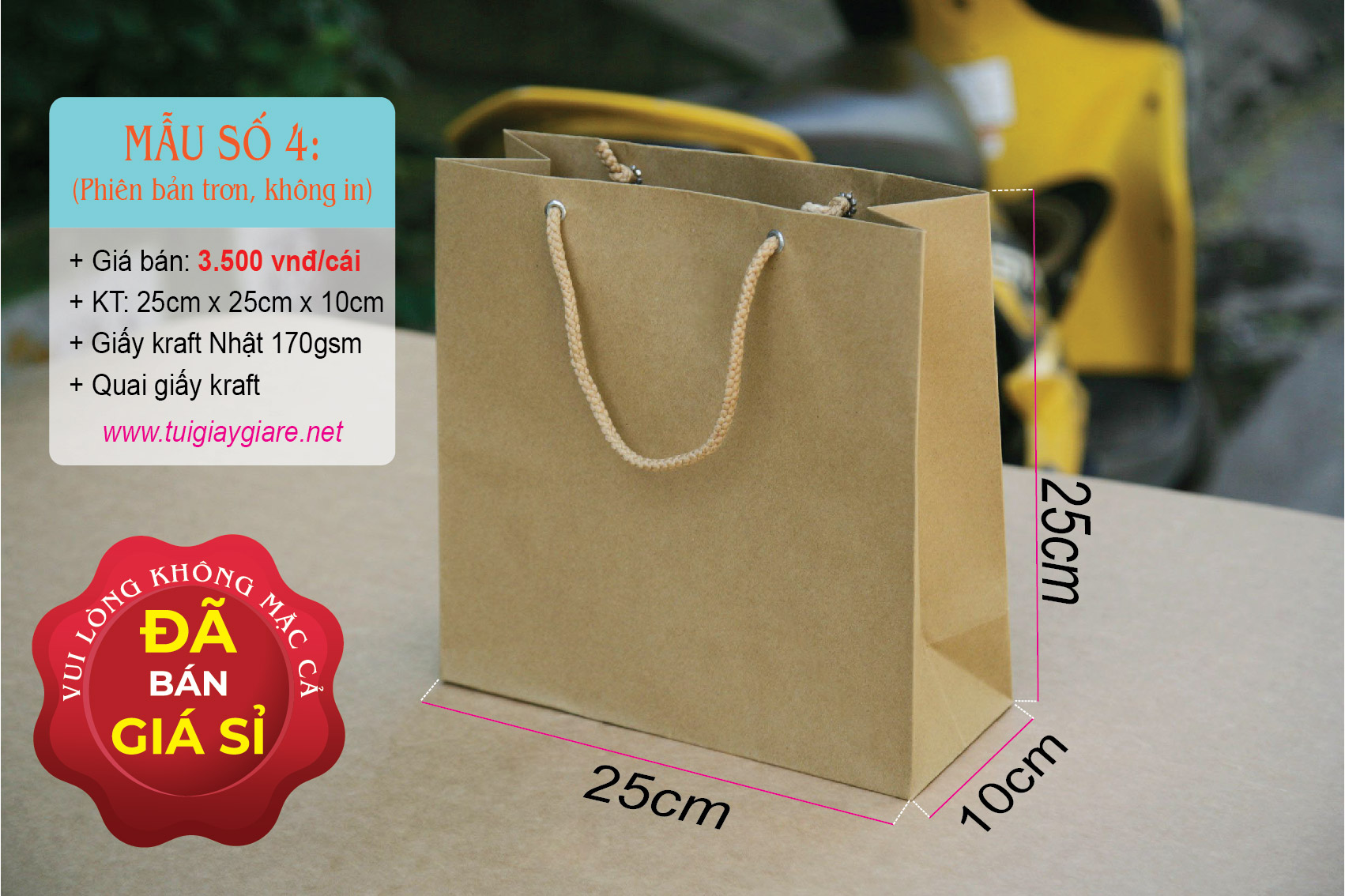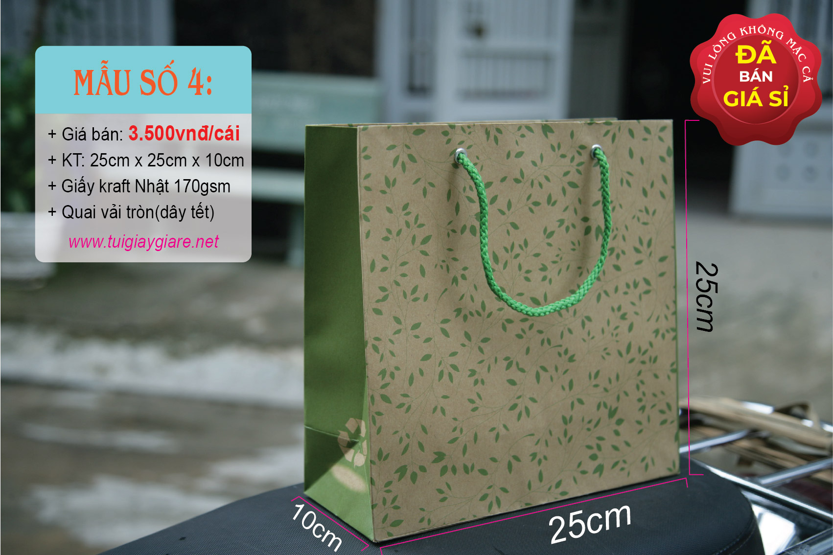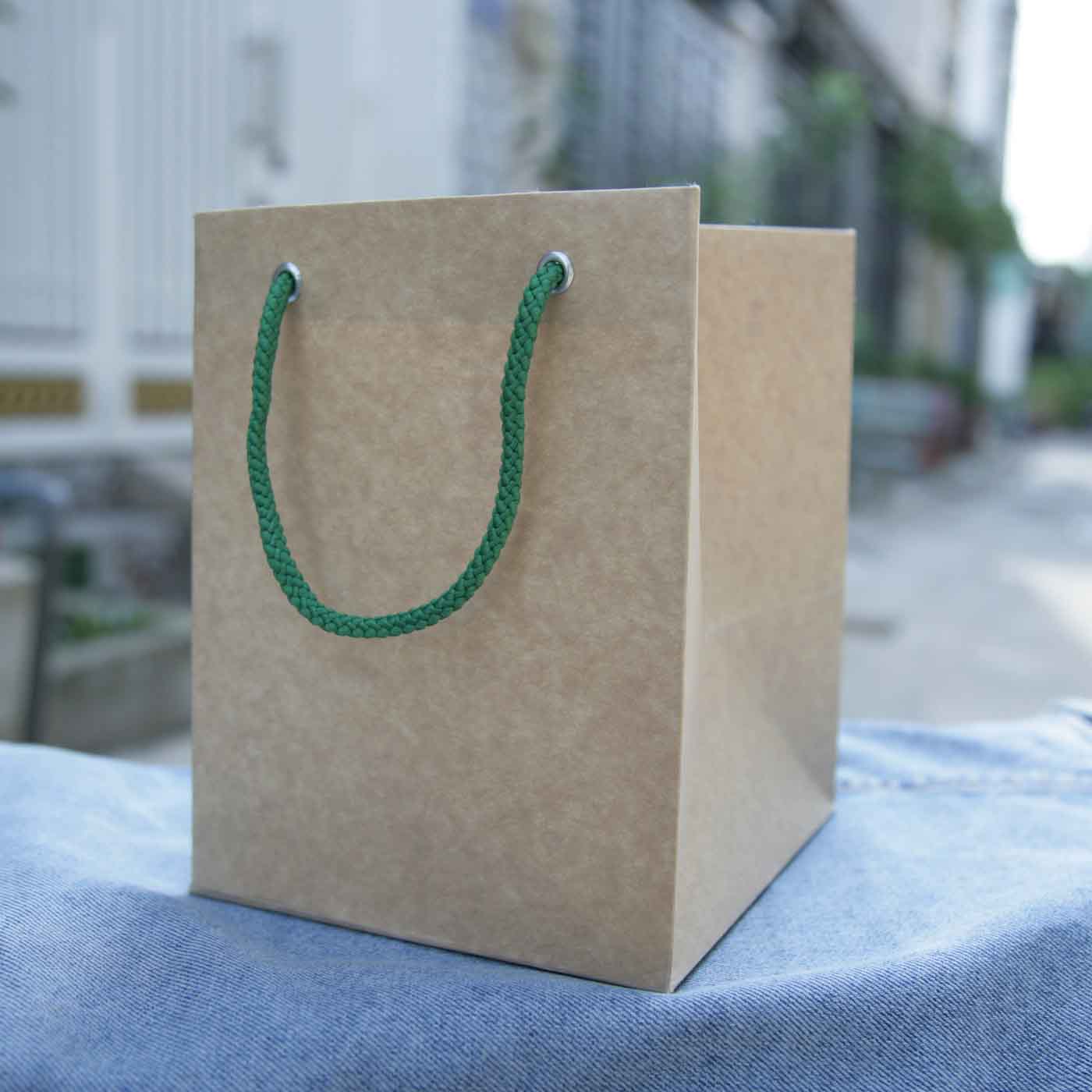 Túi giấy kraft Nhật , Kích thước: 25cm x 25cm x 10cm (cao x ngang x hông). Loại quai: Dây vải tròn xanh. Có thể chứa đồ trọng lượng 800g – 1.5kg. Giá bán: 3.500 đồng/cái