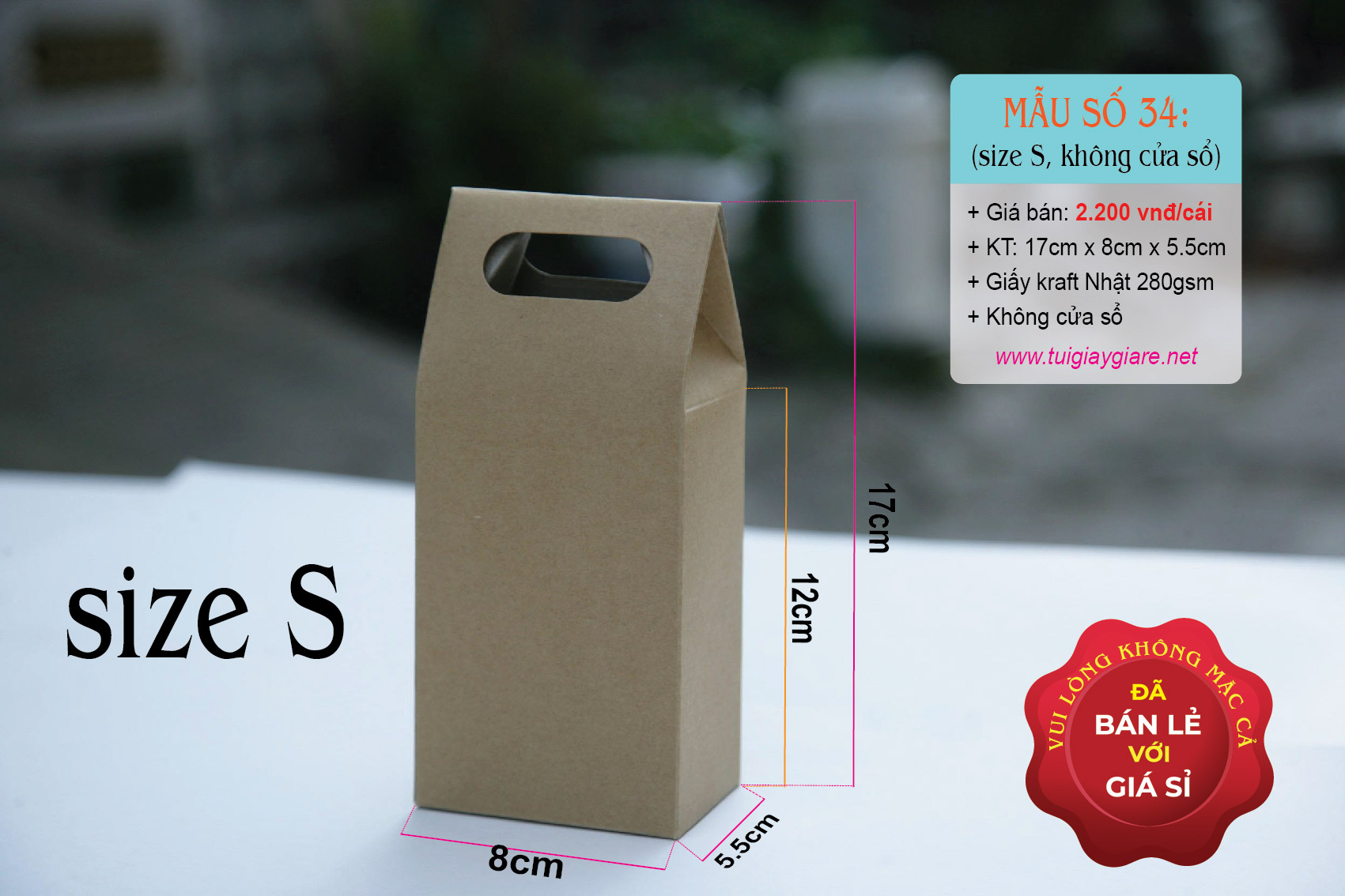 Túi giấy kraft Nhật , Kích thước: 17cm x 12cm x 7cm (cao x ngang x hông). Chất liệu: Giấy Kraft Nhật. Loại quai: Quai vải tròn. Có thể chứa đồ trọng lượng 100g – 600g. Giá bán: 2.200 đồng/cái