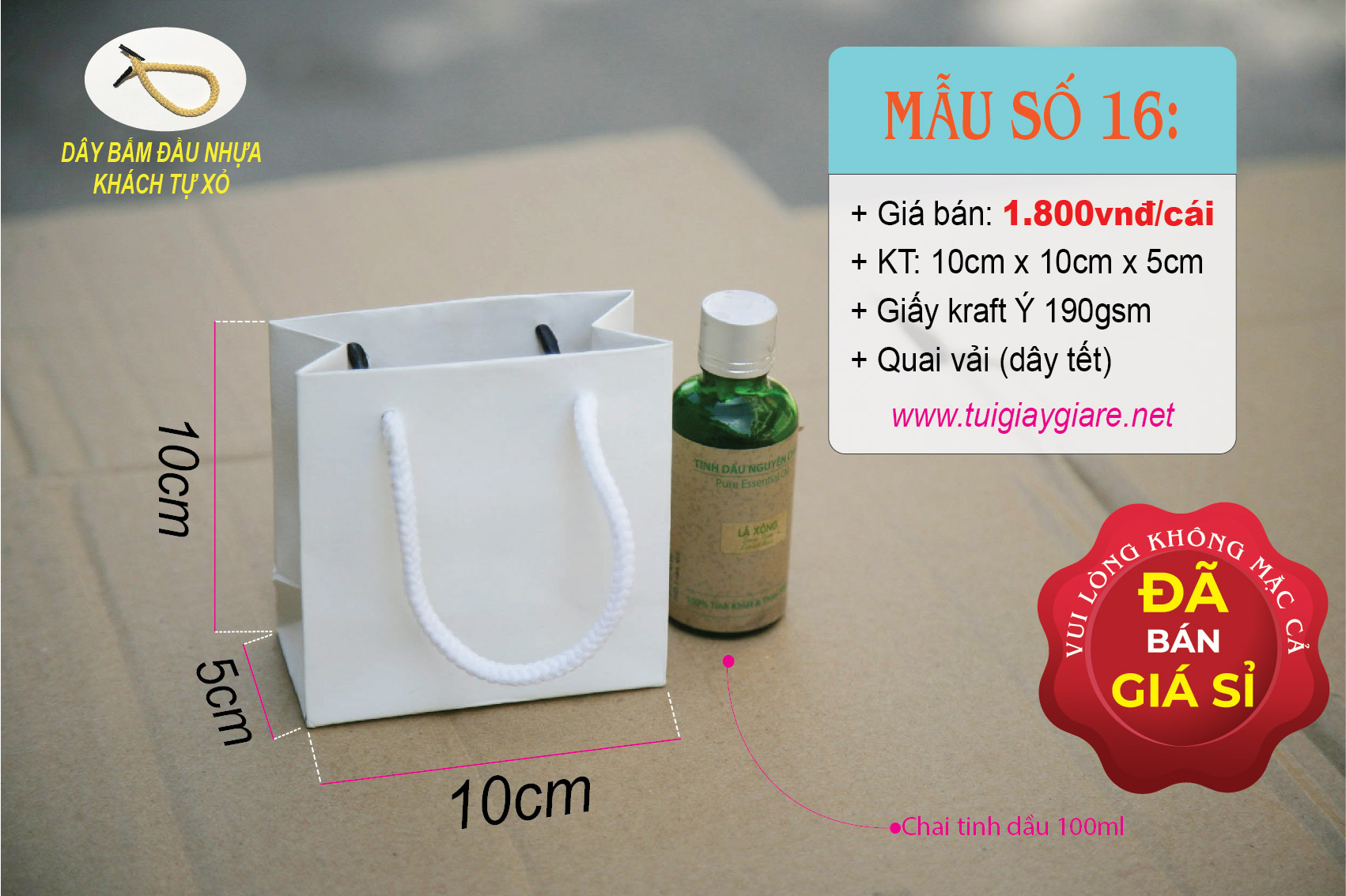 Túi giấy kraft Ý, Kích thước: 16cm x 10cm x 10cm (cao x ngang x hông). Chất liệu: Giấy Kraft Ý (Mặt trong màu trắng láng). Loại quai: Quai vải tròn. Có thể chứa đồ trọng lượng 500g – 1.5kg. Giá bán: 3.500 đồng/cái