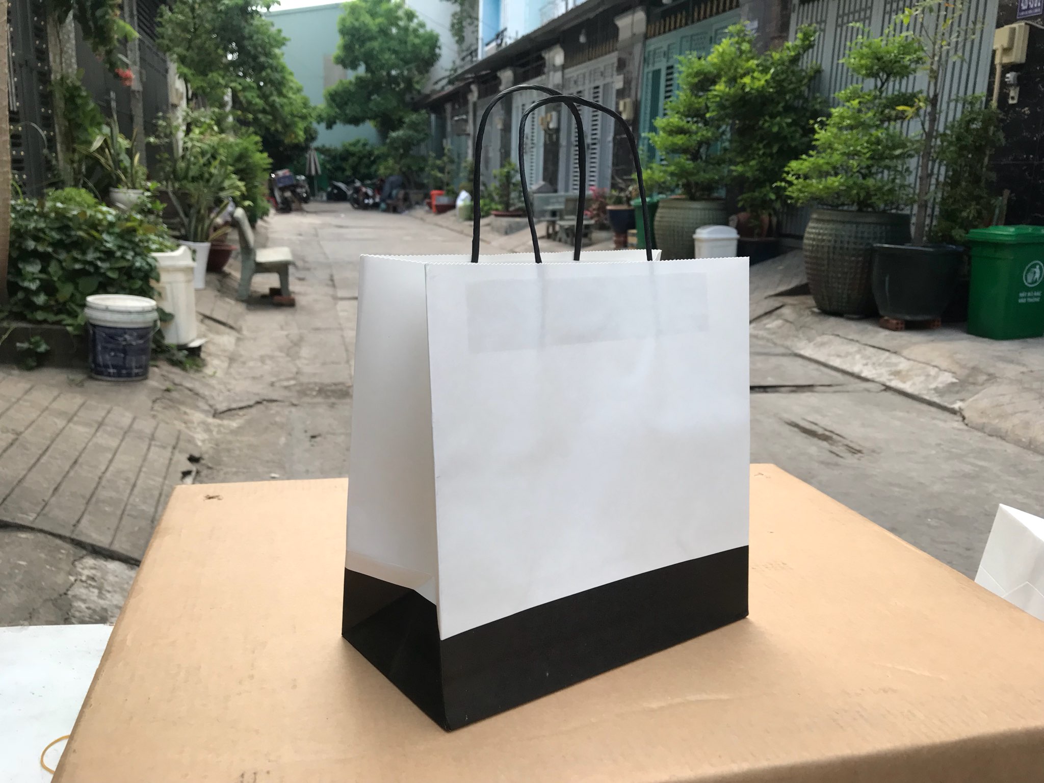 Túi giấy đựng quần áo , Kích thước: 25cm x 25cm x 13cm. Chất liệu: Giấy Kraft trắng 120gsm. Loại quai: Quai giấy Kraft. Có thể chứa đồ trọng lượng 1kg-2kg. Giá bán: 5.500 đồng/cái