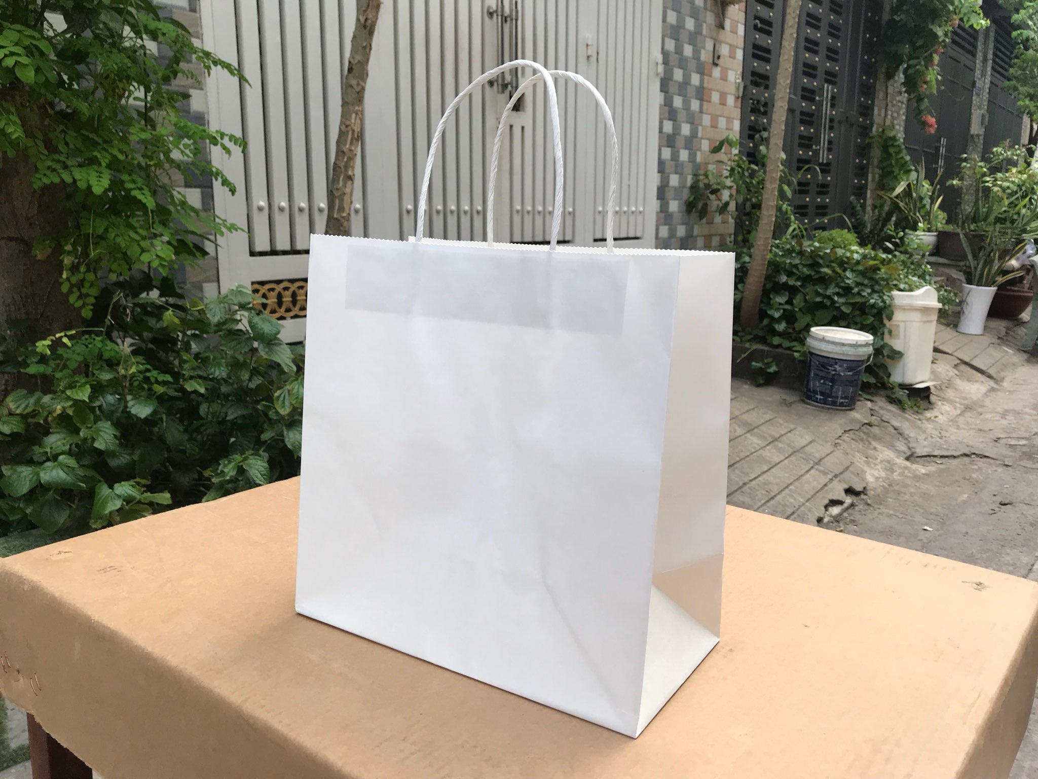 Túi giấy kraft trắng, Kích thước: 19cm x 14,5cm x 7cm (cao x ngang x hông). Chất liệu: Giấy Kraft trắng 120gsm. Loại quai: Quai giấy kraft trắng. Có thể chứa đồ trọng lượng 300g – 800g. Giá bán: 3.500 đồng/cái