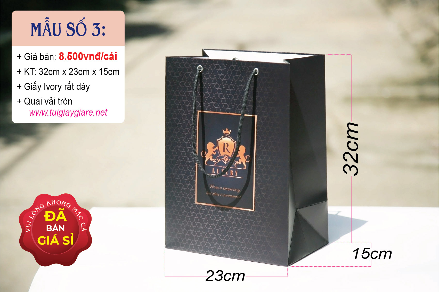 Kích thước: 32cm x 23cm x 15cm (cao x ngang x hông).. Chất liệu: Giấy Ivory 250gsm (dày & cứng). Loại quai: Dây bóng vàng. Cán màn: Cán màn mờ chống thấm. Có thể chứa trọng lượng 3kg – 4kg