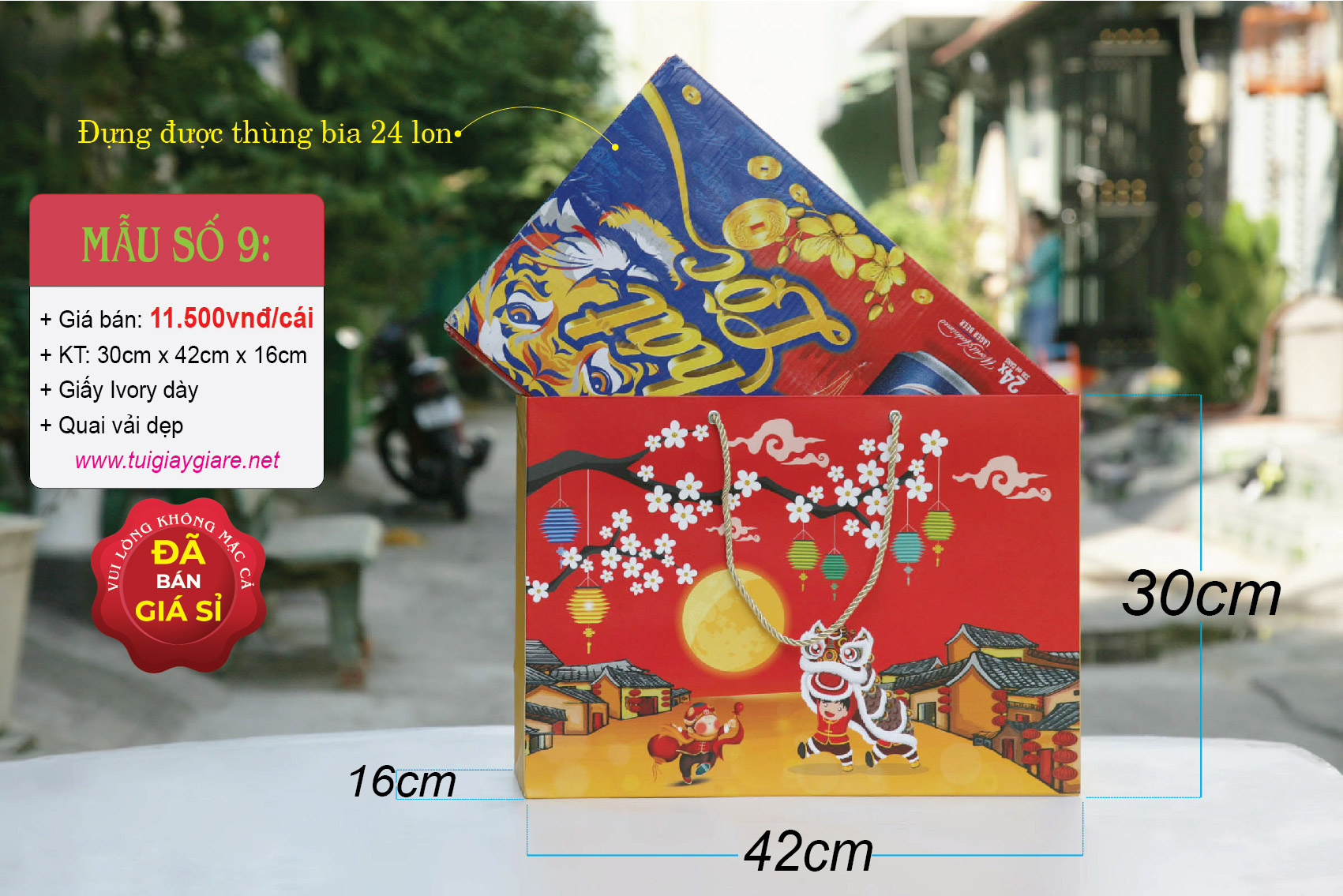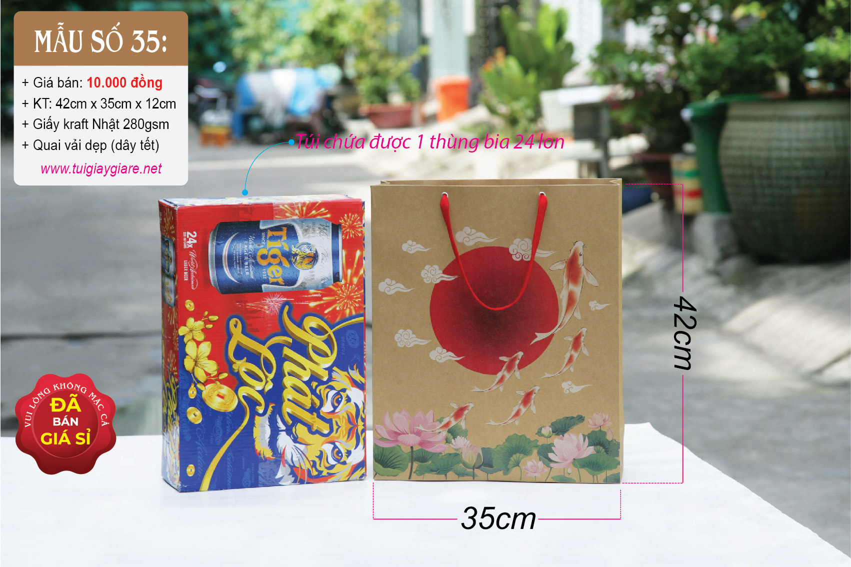 Kích thước: 42cm x 35cm x 12cm (cao x ngang x hông). Chất liệu: Giấy kraft Nhật 280gsm (rất dày & cứng cáp). Loại quai: Dây vải tròn. Có thể chứa trọng lượng 5kg – 8kg. Túi đựng vừa thùng bia 24 lon