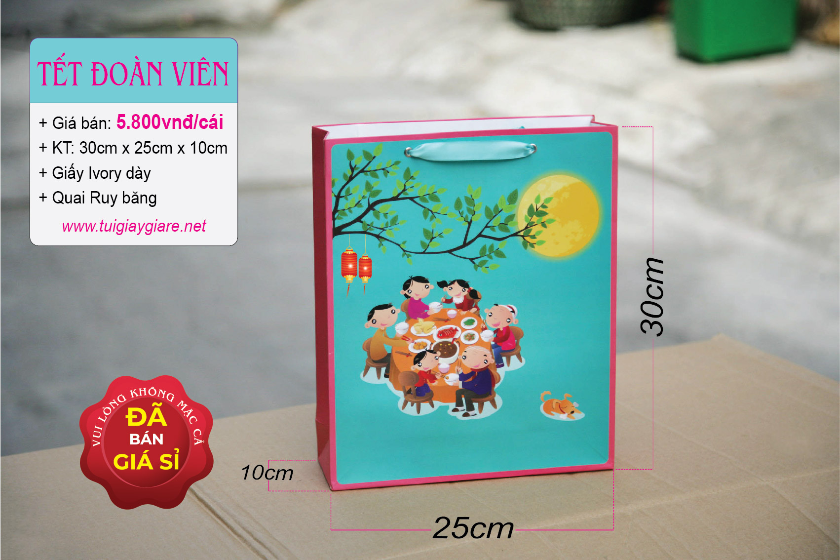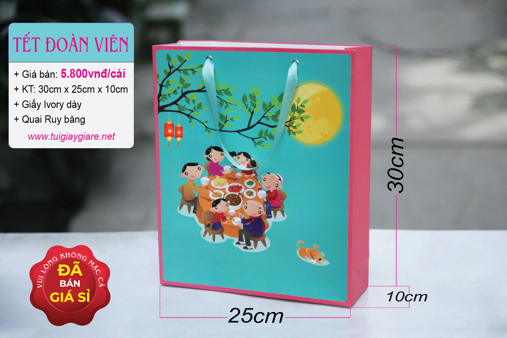 Kích thước: 30cm x 25cm x 10cm (cao x ngang x hông). Chất liệu: Giấy Ivory (dày & cứng). Loại quai: Dây ruy băng như hình. Cán màn: Cán màn mờ chống thấm. Có thể chứa trọng lượng 1,5kg – 2.5kg