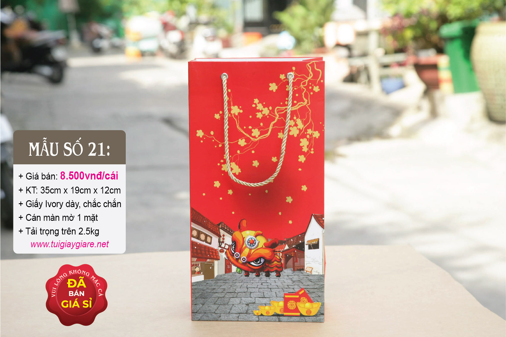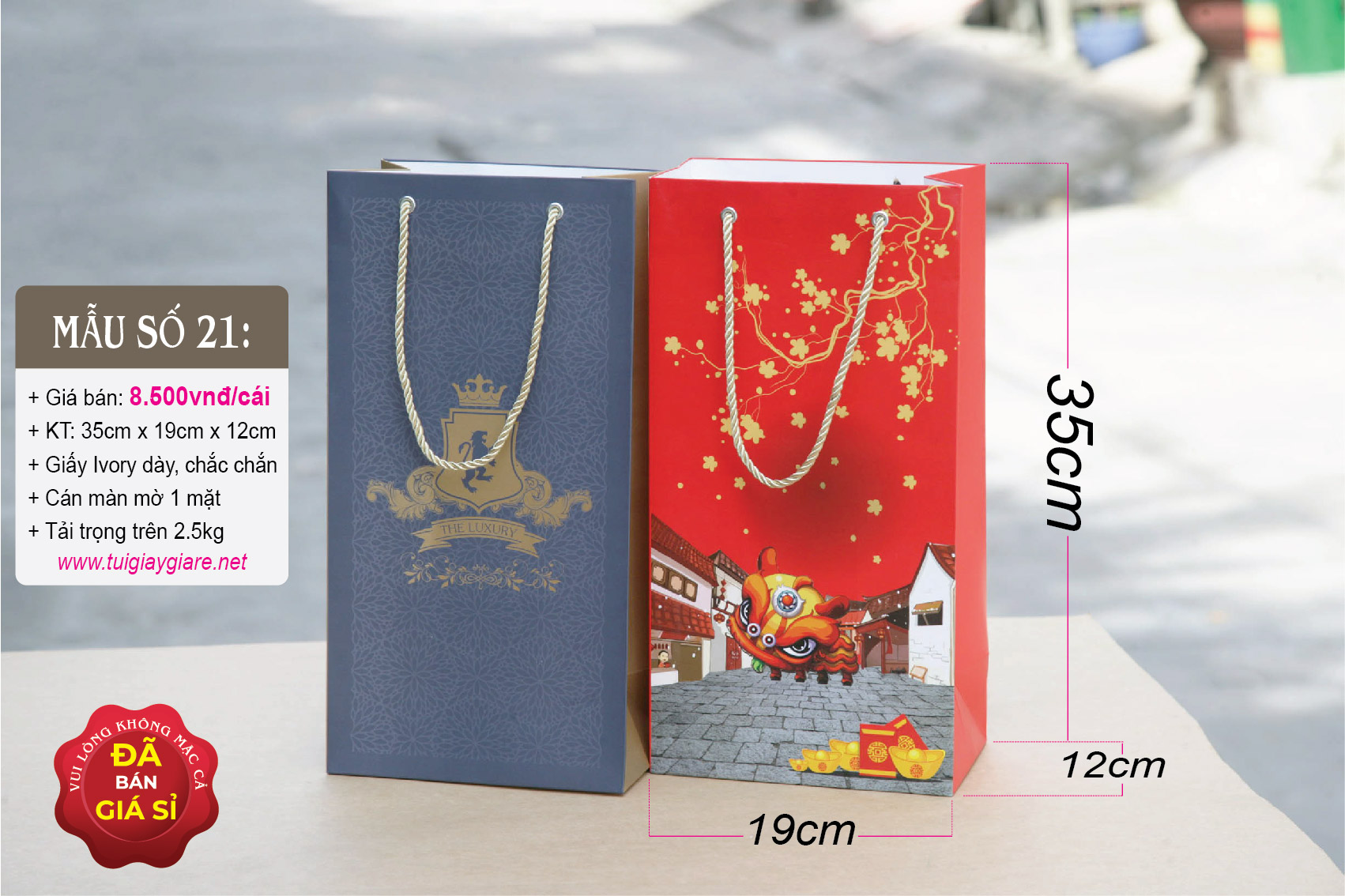Túi giấy đựng quà Tết: thích hợp đựng Rượu ngoại, nước trái cây, tặng phẩm sang trọng. Túi giấy chứa vừa hầu hết các loại rượu ngoại như Chivas 18 có hộp (như hình chụp), Gold Label (chai 1 lít) có hộp, 2 chai rượu vang 750ml …