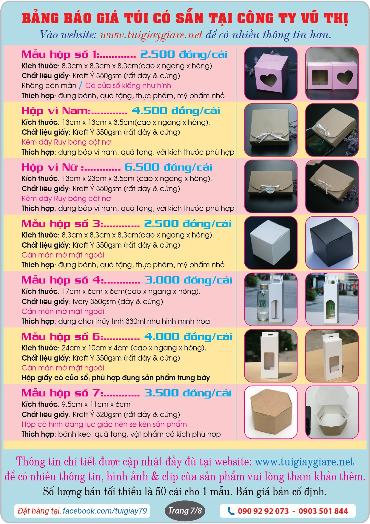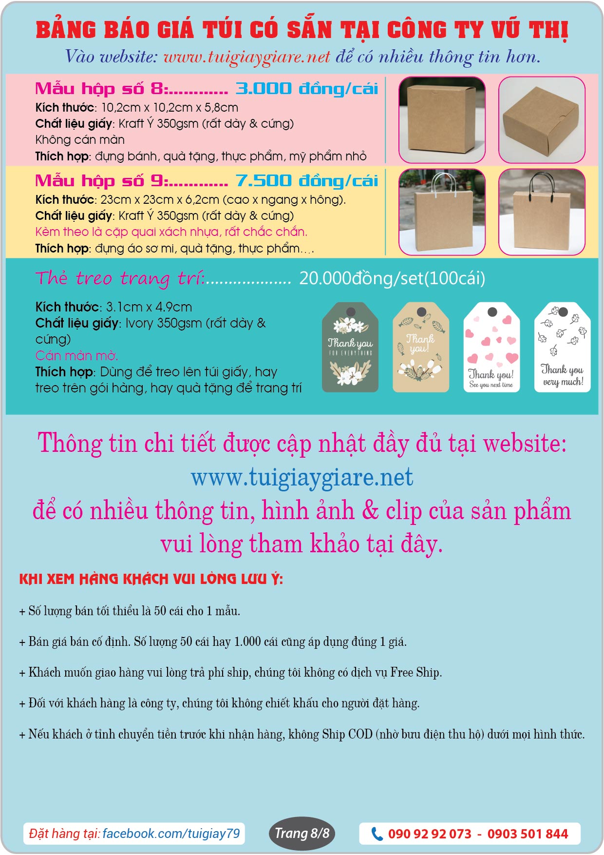 + Công ty in bao bì Vũ Thị là chủ sở hữu và trực tiếp kinh doanh mặt hàng túi giấy làm sẵn trên mạng online. Bao gồm website: https://hopgiaykraft.com và trang Facebook: https://www.facebook.com/tuigiay79