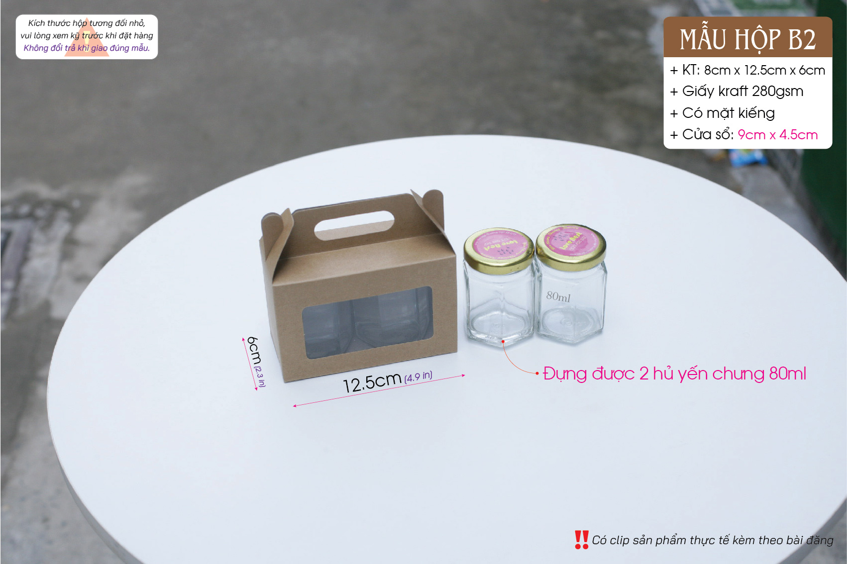 ** Hộp có kích thước nhỏ, thích hợp đựng bánh cookie, bánh kẹo và quà tặng có kích thước nhỏ. Hộp đựng được 2 hủ yến chưng 70ml -85ml.