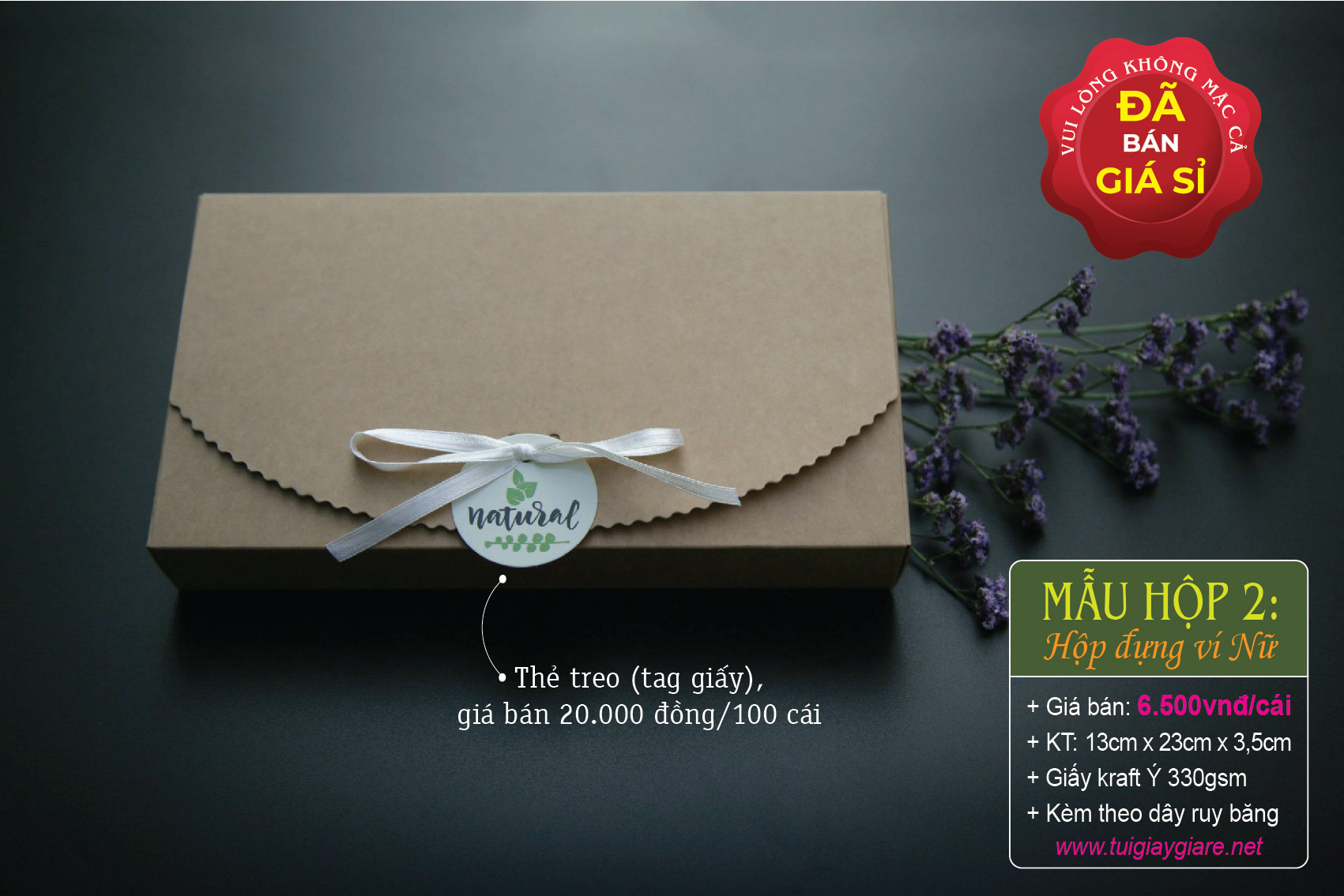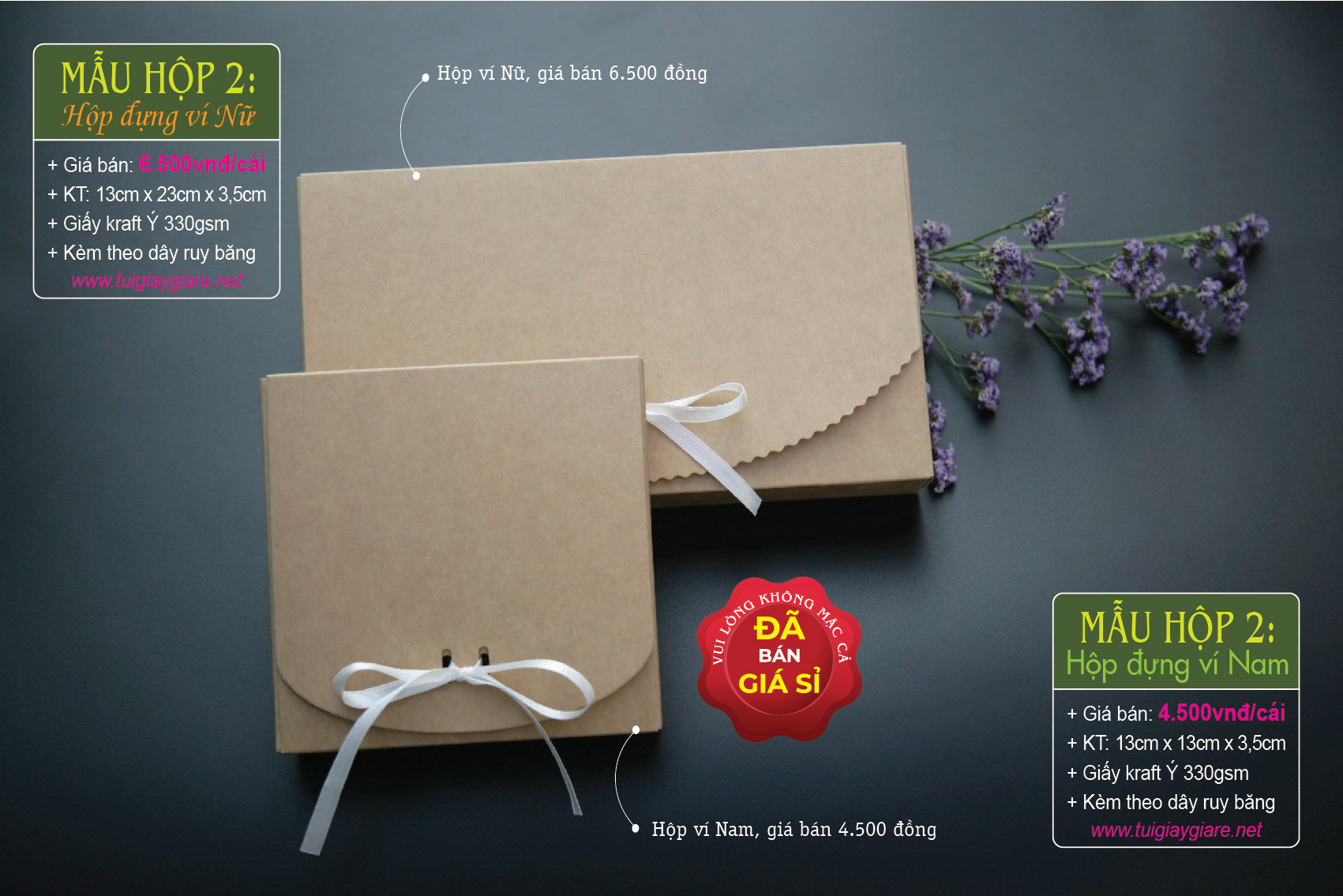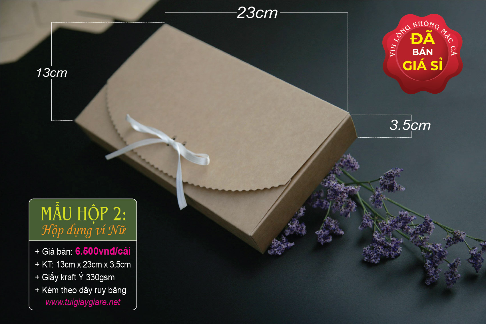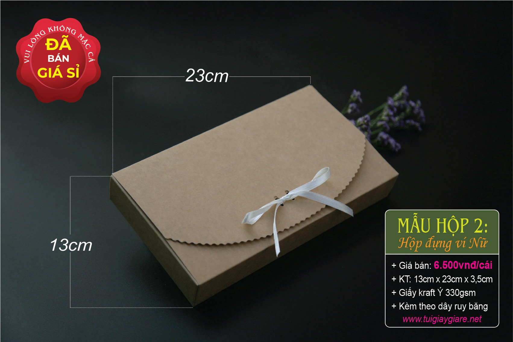 Kích thước hộp ví Nữ: 13cm x 23cm x 3.5cm (như hình). Giá bán: 6.500 đồng/cái