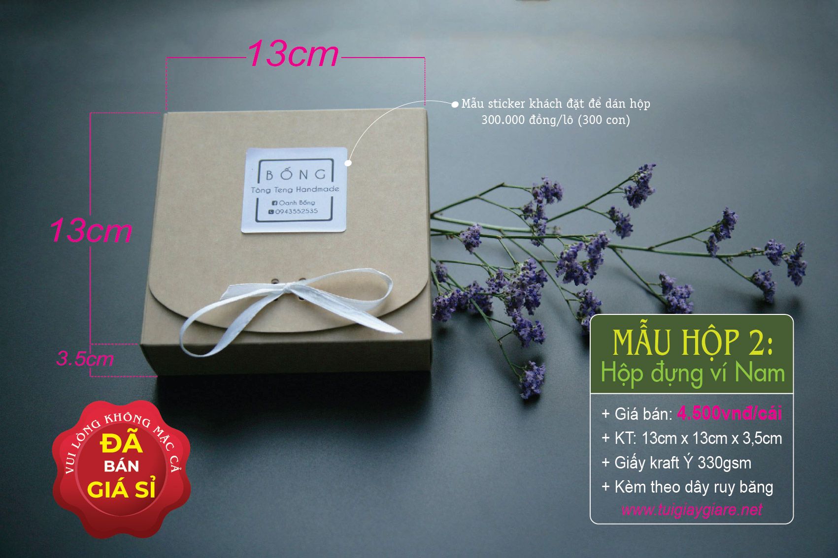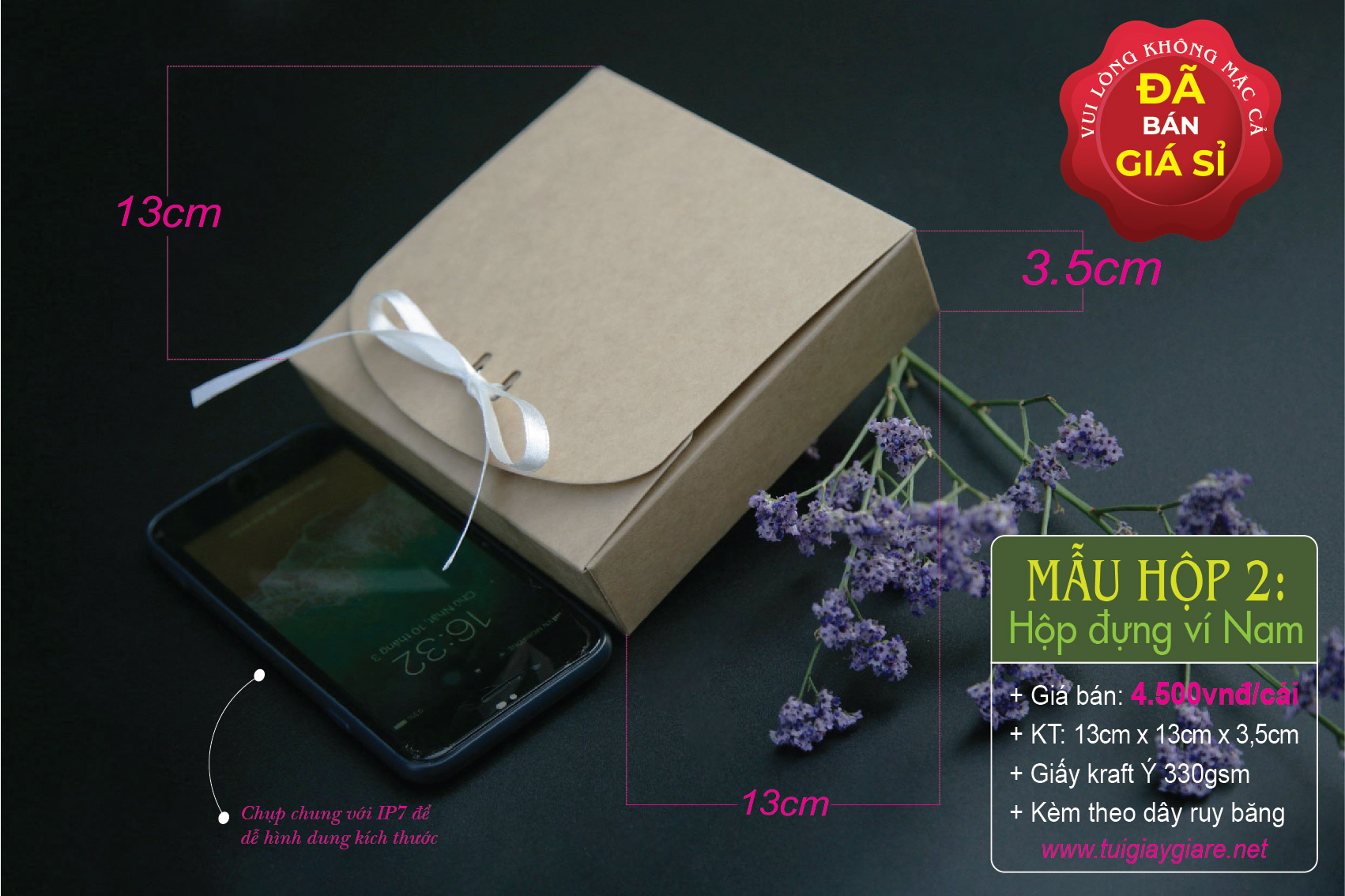 Kích thước hộp ví Nam: 13cm x 13cm x 3.5cm (như hình). Giá bán: 4.500 đồng/cái
