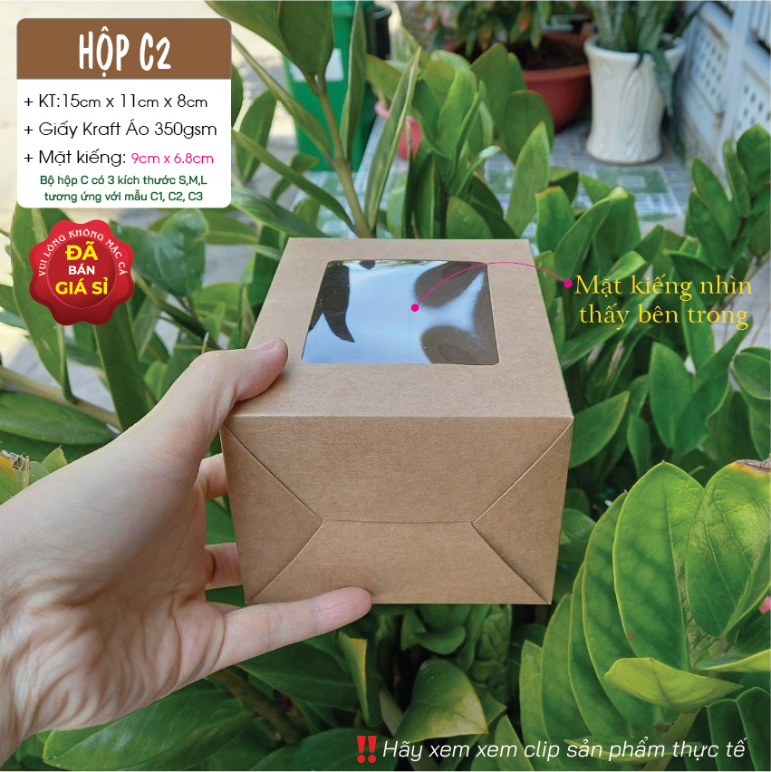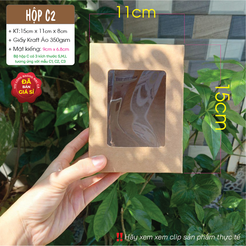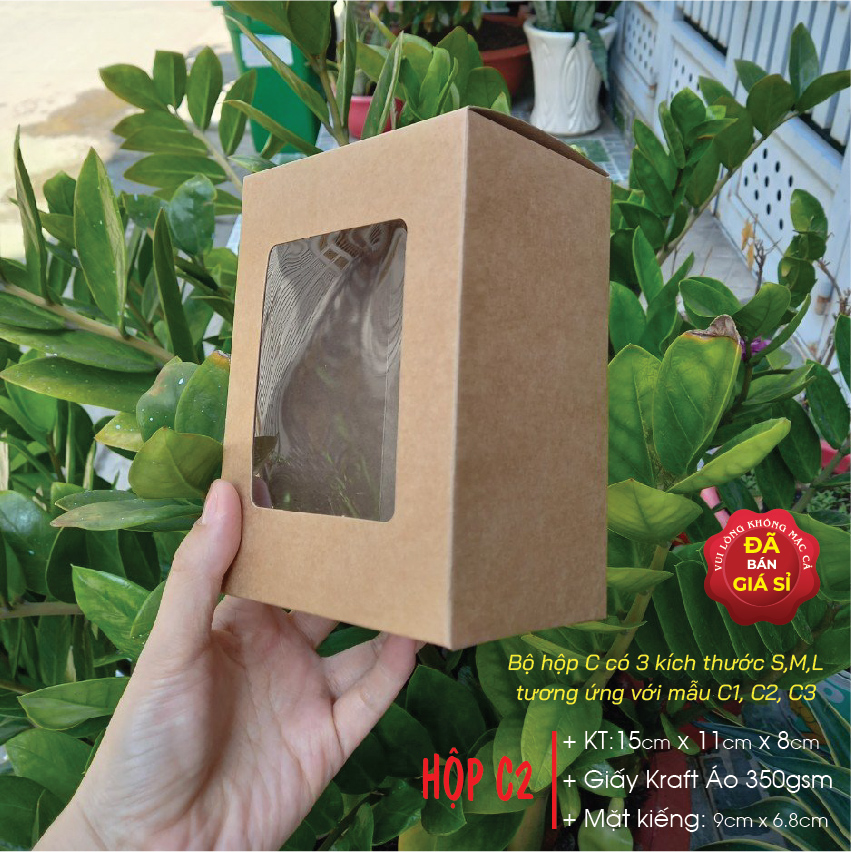 Hộp giấy kraft nâu C2 có mặt kiếng pvc – Brown kraft box with clear window C2 (Bộ hộp C gồm 3 kích thước từ nhỏ đến lớn, từ C1, C2 đến C3)