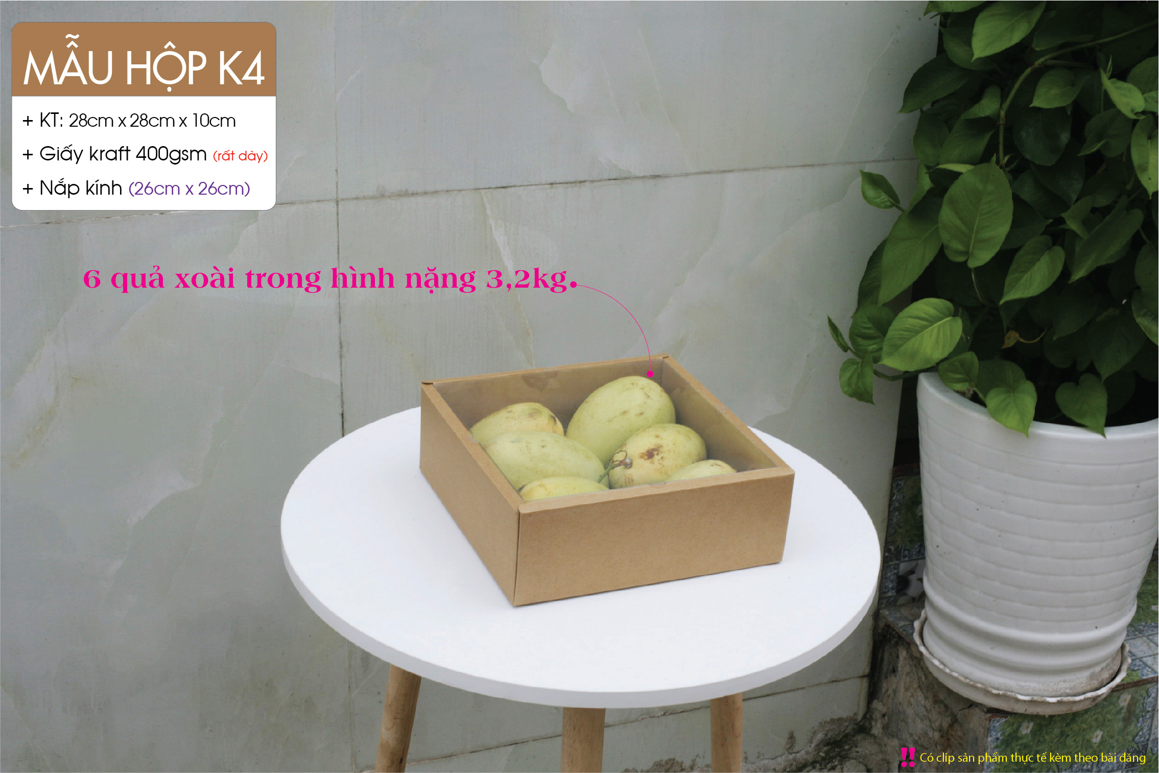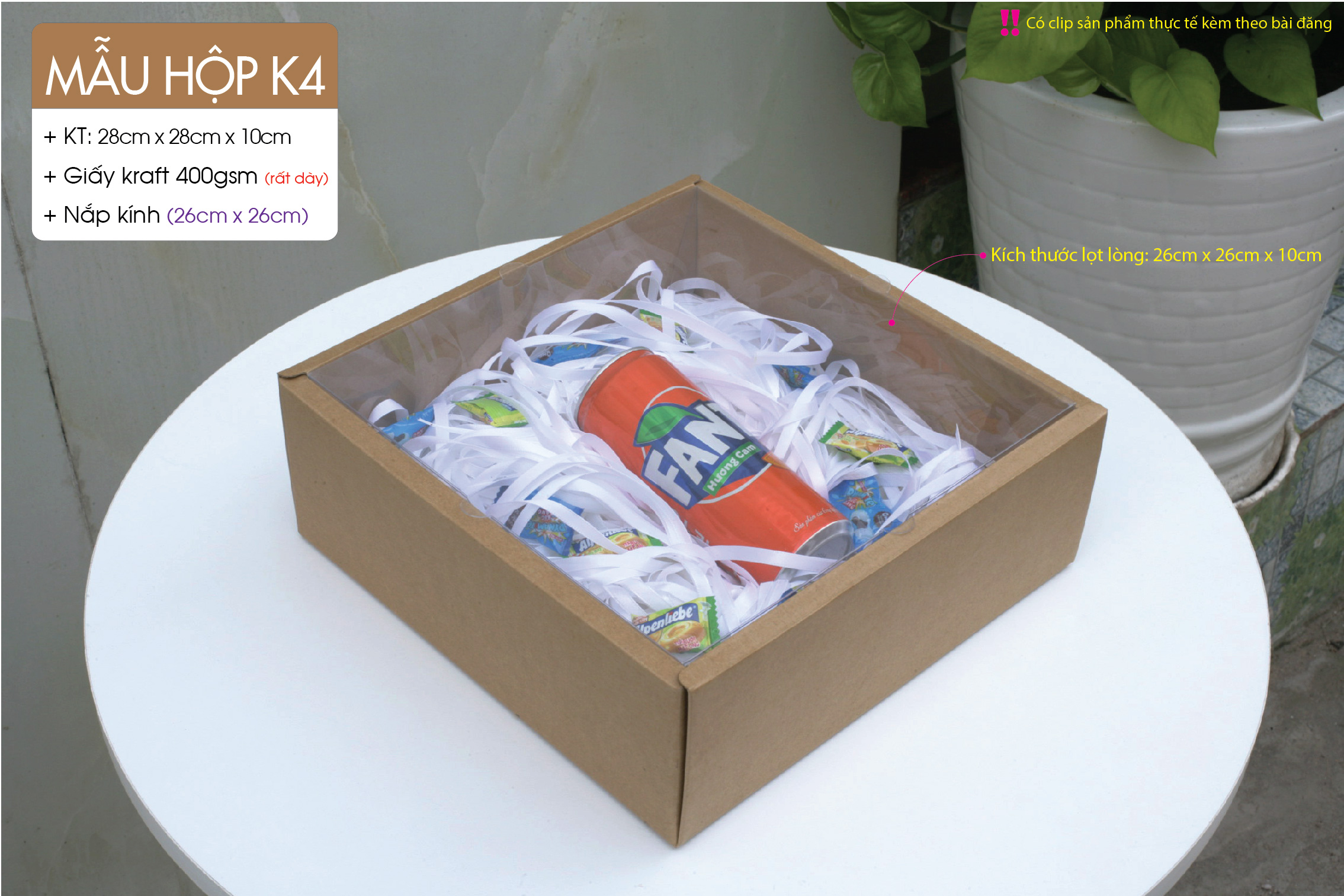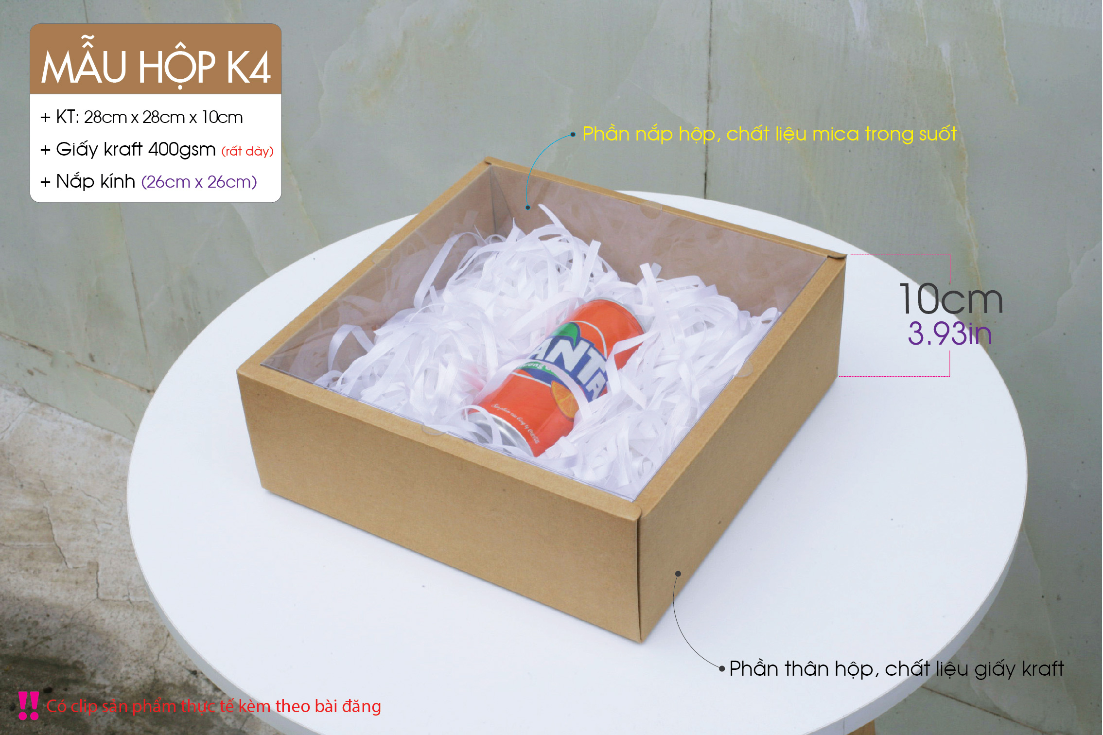 - Phần nắp được làm bằng chất liệu mica (nhựa trong), có kích thước 26cm x 26cm giúp quý khách hàng dễ dàng nhìn thấy sản phẩm bên trong.