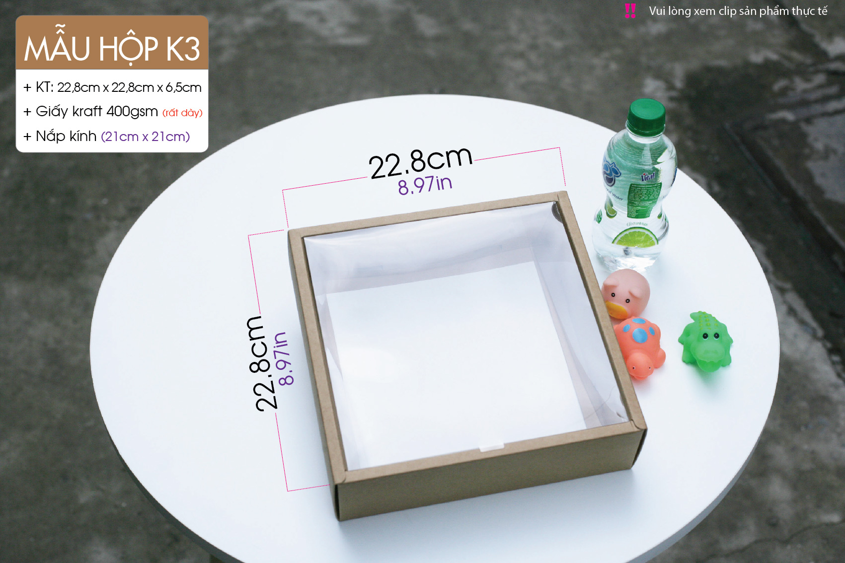 Phần nắp được làm bằng chất liệu mica (là loại nhựa trong mềm) với kích thước của nắp là 21cm x 21cm, cho thấy được sản phẩm bên trong.