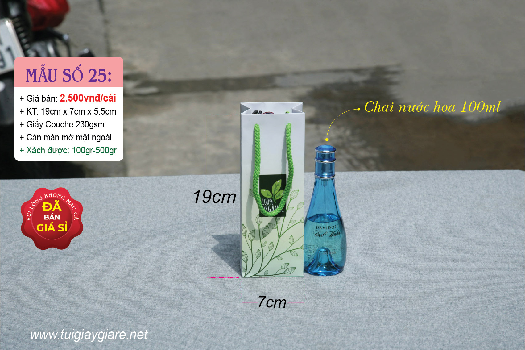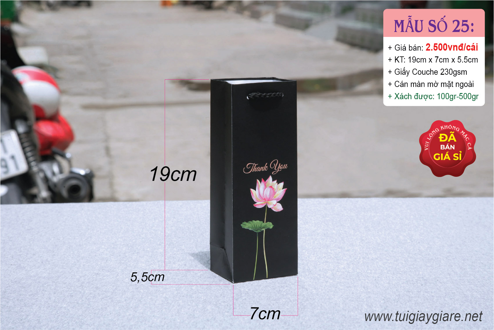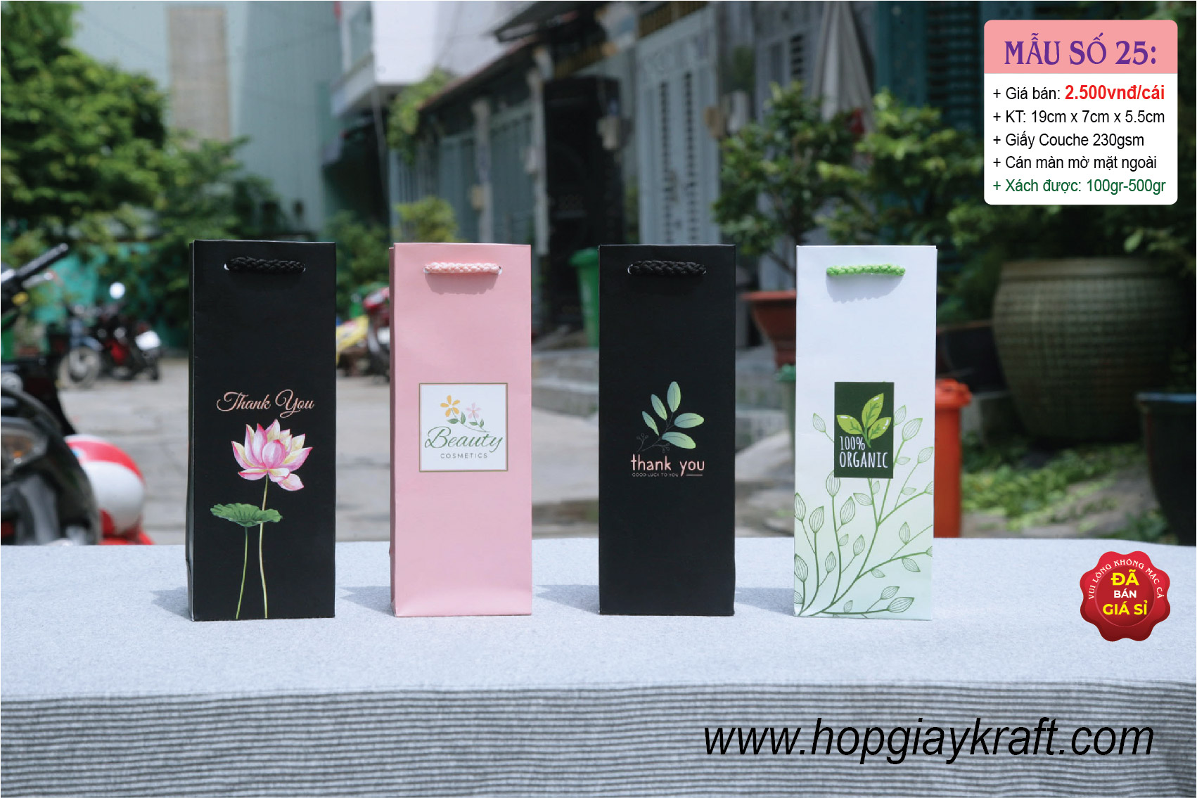 Chất liệu: Giấy Couche 230gsm (độ dày phù hợp với túi)