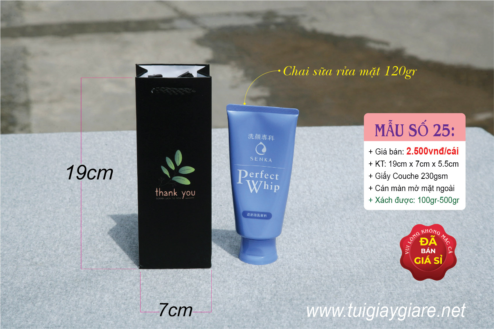 Kích thước: 19cm x 7cm x 5,5cm (cao x ngang x hông).