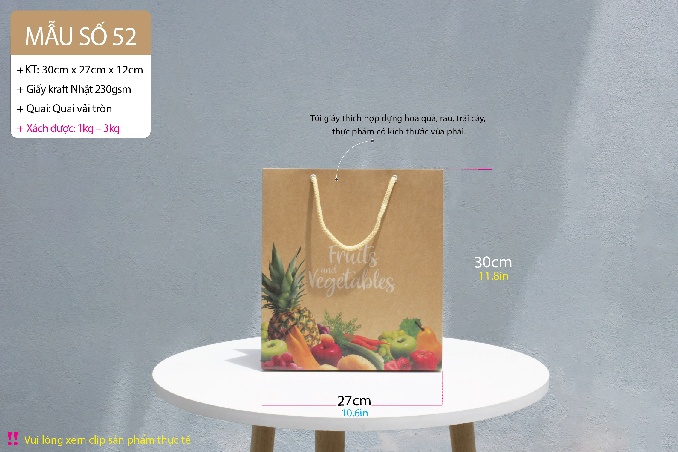 *** Lưu ý: Túi chịu được trọng lượng từ 1kg – 3kg nhưng Quý khách nên lưu ý kích thước từng loại trái cây với kích thước Túi giấy sao cho phù hợp. Ví dụ: Có thể bỏ được 2kg – 3kg quả Quýt, nho vào túi nhưng không thể bỏ 1 quả Sầu riêng 1,5kg vào túi giấy này được nhé !
