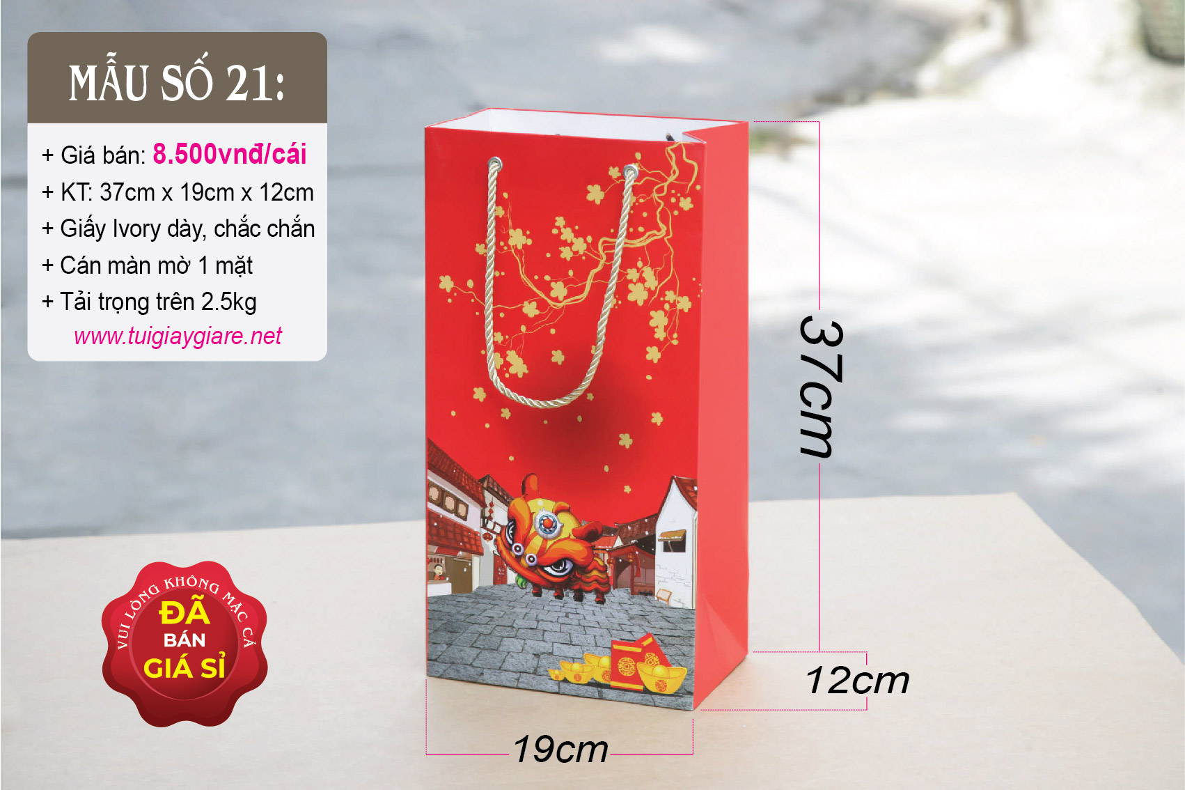 Túi giấy phù hợp đựng Rượu ngoại, nước trái cây, tặng phẩm sang trọng. Túi đựng được hầu hết các loại rượu ngoại như Chivas 18 có hộp (như hình chụp), Chivas 21, Gold Label (như hình chụp với chai 1 lít) có hộp, 2 chai rượu vang 750ml …